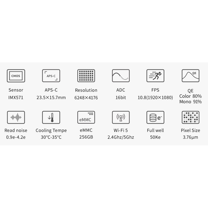 • FPS: la velocidad máxima de fotogramas en modo RAW8 con resolución completa es de 15 fps, lo que es incluso más rápido que la ASI 2600MC Pro normal.