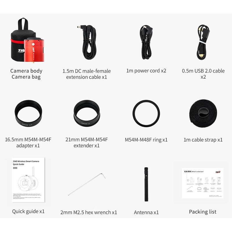 WLAN de doble banda: la antena externa de doble banda, compatible con frecuencias de 2,4 GHz y 5 GHz, permite un uso estable y fluido de la cámara en un radio de 20 metros. Con la aplicación ASIAir de ZWO, puede controlar la cámara y ver las imágenes fácilmente a través de su Smartphone.