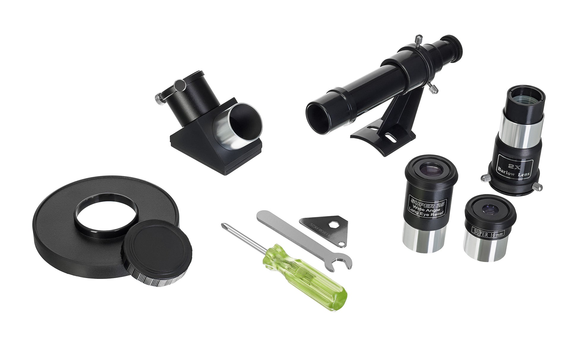 Con su lente objetivo acromática de 70 mm y una distancia focal de 900 mm, el telescopio produce imágenes brillantes y nítidas con una distorsión mínima. Los oculares de 10 mm (90x) y 25 mm (36x), junto con la lente de Barlow de 2x, ofrecen una sólida gama de aumentos para obtener tanto vistas panorámicas como primeros planos detallados. Un buscador óptico de 6x24 le ayuda a localizar objetivos en el cielo, mientras que el espejo diagonal le permite observar cómodamente objetos terrestres.