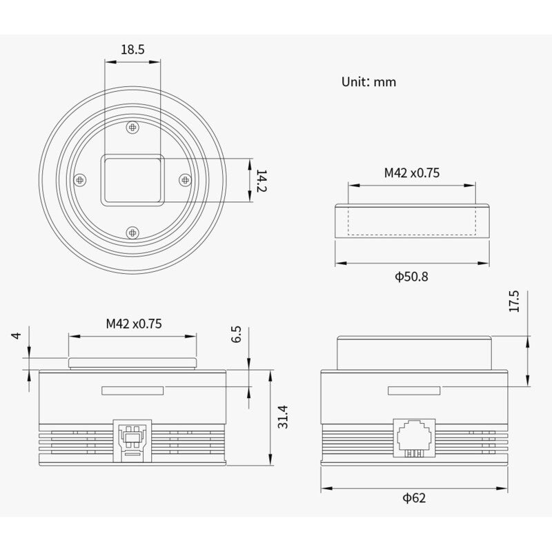 La cámara está equipada con unmoderno sensor Sony IMX585y destaca especialmente por sualta resolución(2,9 µm Pixel), su alta velocidad de fotogramas y laausenciatotalde brillo del amplificador(Amp Glow). Esto hace que esta cámara sea muy interesante no solo para planetas, sol y luna, sino también para exposiciones prolongadas (fotografía de cielo profundo). El sensor es lo suficientemente grande para muchos objetos de cielo profundo, incluso sin el uso de un corrector adicional.