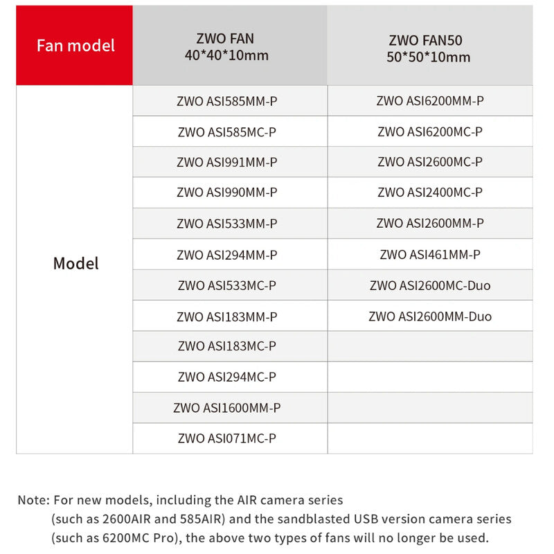 Los nuevos modelos de cámaras ZWO, incluyendo la serie AIR (por ejemplo, 2600AIR y 585AIR) y las versiones USB con acabado arenado (como la ASI6200MC Pro), ya no utilizan ninguno de estos dos tipos de ventiladores.