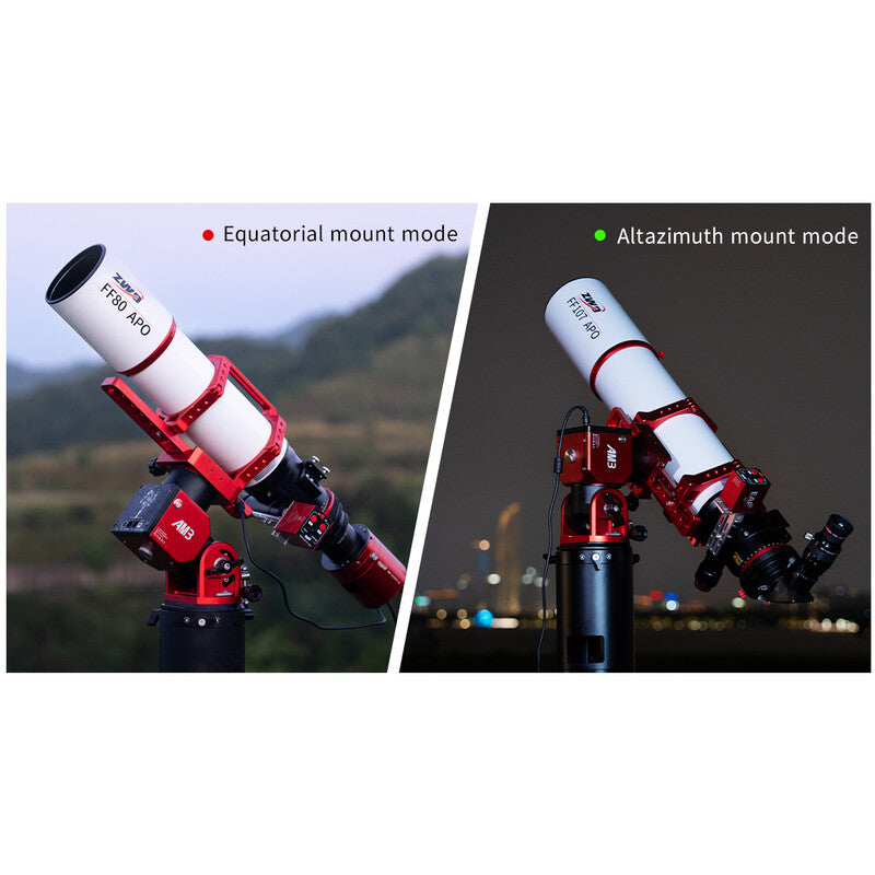 La AM3 puede funcionar en posición ecuatorial y azimutal. Para fotografía astronómica se utiliza el modo ecuatorial. La montura debe alinearse con la mayor exactitud posible con el polo celeste. Para la observación visual o la fotografía lunar y planetaria, el modo azimutal es suficiente. En pocos minutos, la tendrá lista para su uso. El indicador de estado muestra siempre en qué modo se encuentra la montura: rojo indica modo ecuatorial y verde azimutal.