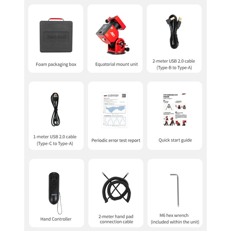ZWO presenta la montura ecuatorial Harmonic AM3, un modelo transportable para fotografía astronómica. Esta montura pesa menos de 4 kg y puede con telescopios de hasta 8 kg sin contrapeso. Con contrapeso y barra de contrapesos (no incluidos), puede con telescopios de hasta 13 kg. Varios años de desarrollo y diversas patentes han dado su fruto con esta apasionante montura.