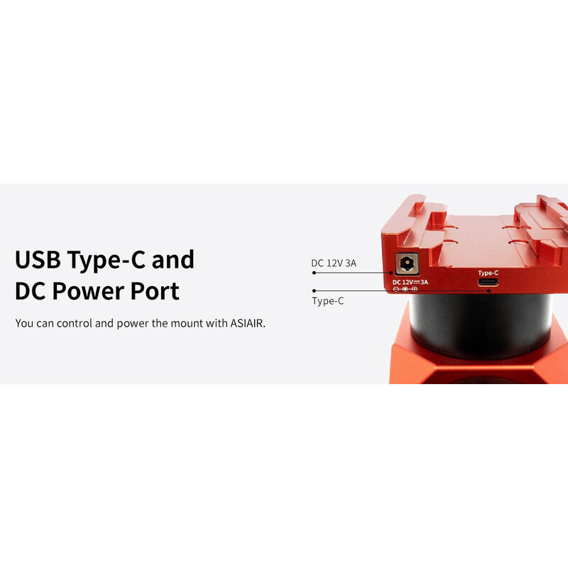 Novedad en esta versión 2: la aplicación ahora también es compatible con Bluetooth y la abrazadera de prisma dual tiene una conexión CC y un puerto USB-C. De este modo, los cables ya no se enredan tan fácilmente. El AM5 N tiene una rosca interna de 3/8" en la parte inferior plana, por lo que se puede colocar directamente sobre trípodes fotográficos adecuados. GoTo, Live Preview y mucho más se pueden controlar ahora a través del Smartphone o la tableta. Esto hace que el AM5 N sea ideal en combinación con el ZWO ASI Air.