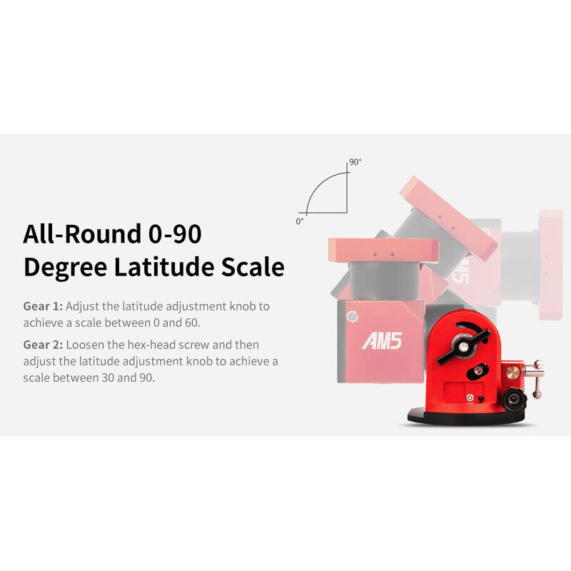 La nueva versión «N» de la ZWO AM5 soporta telescopios de hasta 15 kg sin contrapeso e incluso hasta 20 kg con contrapeso (el contrapeso y la barra de contrapeso se venden por separado). La montura compacta y muy ligera, con un peso propio de solo 5,5 kg, se puede utilizar en modo paraláctico para astrofotografía y en modo azimutal para observación.