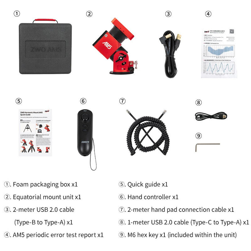 ZWO presenta la montura ecuatorial Harmonic AM5, un modelo transportable para fotografía astronómica. Esta montura pesa menos de 5 kg y puede con telescopios de hasta 13 kg sin contrapeso. Con contrapeso y barra de contrapesos (no incluidos), puede con telescopios de hasta 20 kg. Varios años de desarrollo y diversas patentes han dado su fruto con esta apasionante montura.