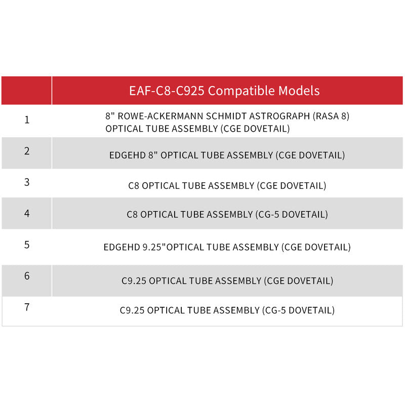 Este juego adaptador permite conectar el EAF a varios telescopios SC de Celestron. Al montarlo, el anillo naranja permanece en el telescopio. El soporte se monta adicionalmente.
