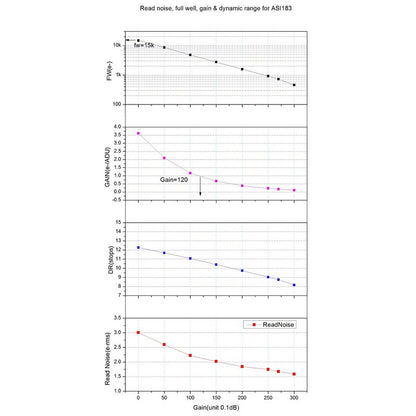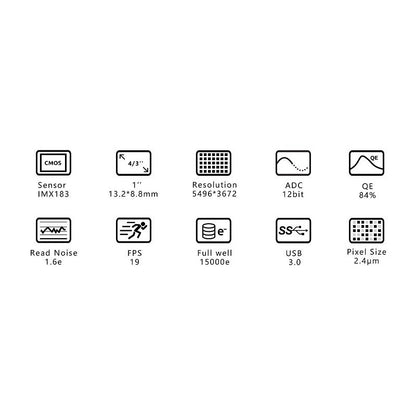 Especialmente diseñados para aplicaciones astronómicas, los sensores IMX183CLK-J (monocromático) y IMX183CQJ-J (color) de Sony se alojan en un diseño de alta sensibilidad con retroiluminación (BSI) y píxeles de solo 2,4 µm. Las cámaras ASI 183 presentan una carga Full Well Capacity extraordinariamente alta de 15 000 electrones para unos píxeles tan pequeños.