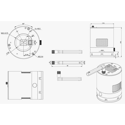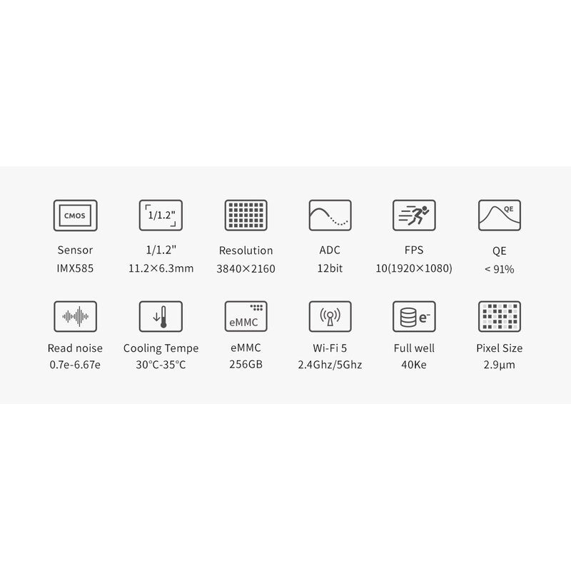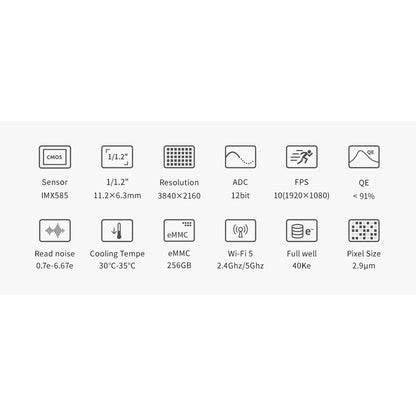 WLAN de doble banda: la antena externa de doble banda, compatible con frecuencias de 2,4 GHz y 5 GHz, permite un uso estable y fluido de la cámara en un radio de 20 metros. Con la aplicación ASIAir de ZWO, puede controlar la cámara y ver las imágenes fácilmente a través de su Smartphone.