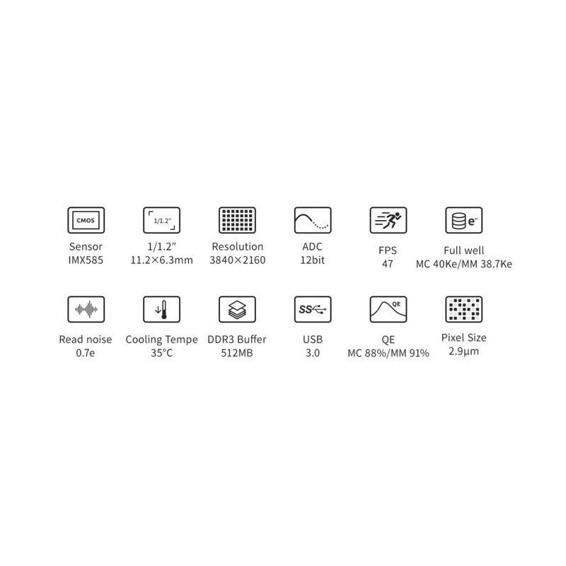 La ASI 585M Pro está equipada con un moderno sensor de 3840 x 2160 píxeles. El sensor Sony IMX585 convence sobre todo por su alta resolución (2,9 µm píxeles), su alta frecuencia de imagen y la ausencia total del molesto brillo del amplificador (Amp-Glow). Esto hace que esta cámara sea ideal no solo para fotografiar planetas, el sol y la luna, sino también para la fotografía DeepSky. El sensor es lo suficientemente grande para muchos objetos DeepSky, por lo que normalmente no es necesario utilizar un corrector. La cámara es ideal para: