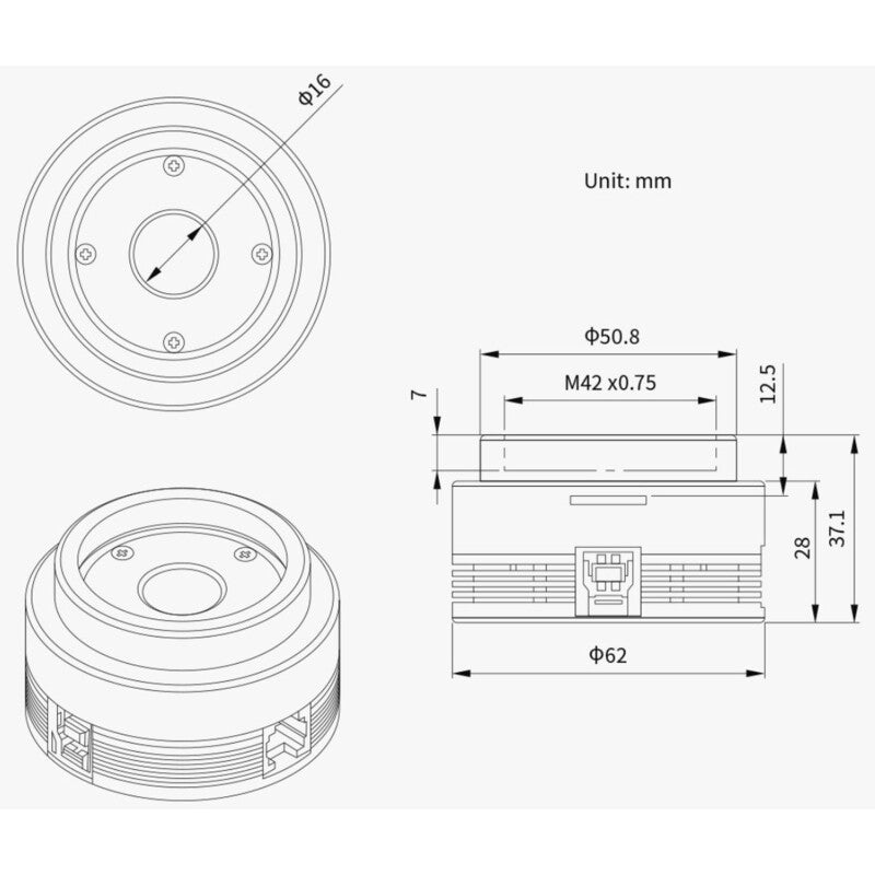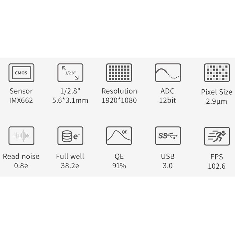 La ASI 662 ofrece unaresolución muy alta, por lo que es perfecta para fotografiar la Luna y los planetas. Pero con esta cámara sin refrigeración también es posible realizar EAA (astronomía asistida electrónicamente) y astrofotografía DeepSky.Esta cámara CMOS está equipada con un moderno sensor de 1/2,8" con 1920*1080 píxeles. Elsensor IMX662ofrece, además de la moderna tecnología de retroiluminación, unaimagen extremadamente nítida sin brillo del amplificador(Amp-Glow) y convence por su alta resolución (2,9 µm Pixel) con una alta velocidad de fotogramas.