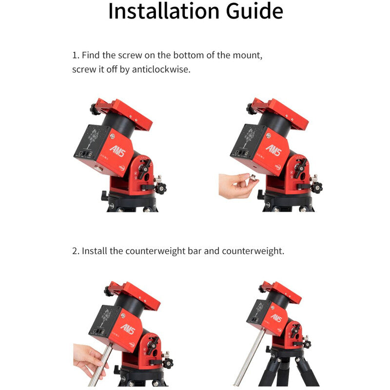 La barra de contrapeso es adecuada para la montura ZWO AM5. Se recomienda para cargas superiores a 13 kg.