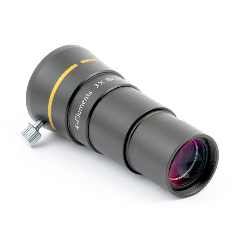 Una lente Barlow (llamada así por su inventor, Peter Barlow) esuna lente divergente que multiplica artificialmente la distancia focalde un instrumento. Esta lente Barlow de Keplercuenta con un elemento cuádruple apocromático de alta calidad que minimiza la aberración cromática. Le permitirá triplicar el aumento de sus oculares de 31,75 mm.En el campo de la imagen, permite aumentar la distancia focal para, por ejemplo, ampliar los planetas en el sensor.