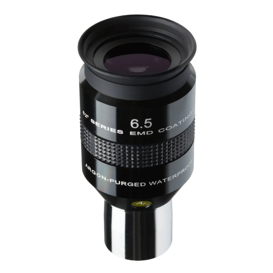 Son excelentes oculares multi-elemento de campo plano que cambiarán su experiencia de visualización astronómica. El tratamiento patentado EMD proporciona un alto contraste y evita los molestos reflejos. Otra gran ventaja de estos oculares es su extraordinaria nitidez, que se nota sobre todo al observar los planetas y la Luna. Los oculares de alto rendimiento con distancias focales cortas (elevados aumentos) desde 3 mm hasta 10 mm no solo se utilizan para las observaciones de la Luna, los planetas y las estrellas binarias, sino que también se pueden usar para objetos compactos y brillantes de Deep Sky. No solo el tamaño de una nebulosa planetaria o un cúmulo globular será impresionante cuando llenen el campo visual completo de un ocular, sino que además el cielo de fondo será muy oscuro, ya que aumenta considerablemente el contraste efectivo a medida que se incrementan los aumentos. No obstante, para que se pueda generar una imagen nítida con mucho aumento, es necesario que las condiciones atmosféricas sean buenas o excelentes. El ocular de 6,5 mm de la serie 82° LER es una opción muy popular para muchos telescopios, que permite lograr directamente el máximo aumento posible sin teleconvertidor adicional ni lente Barlow.