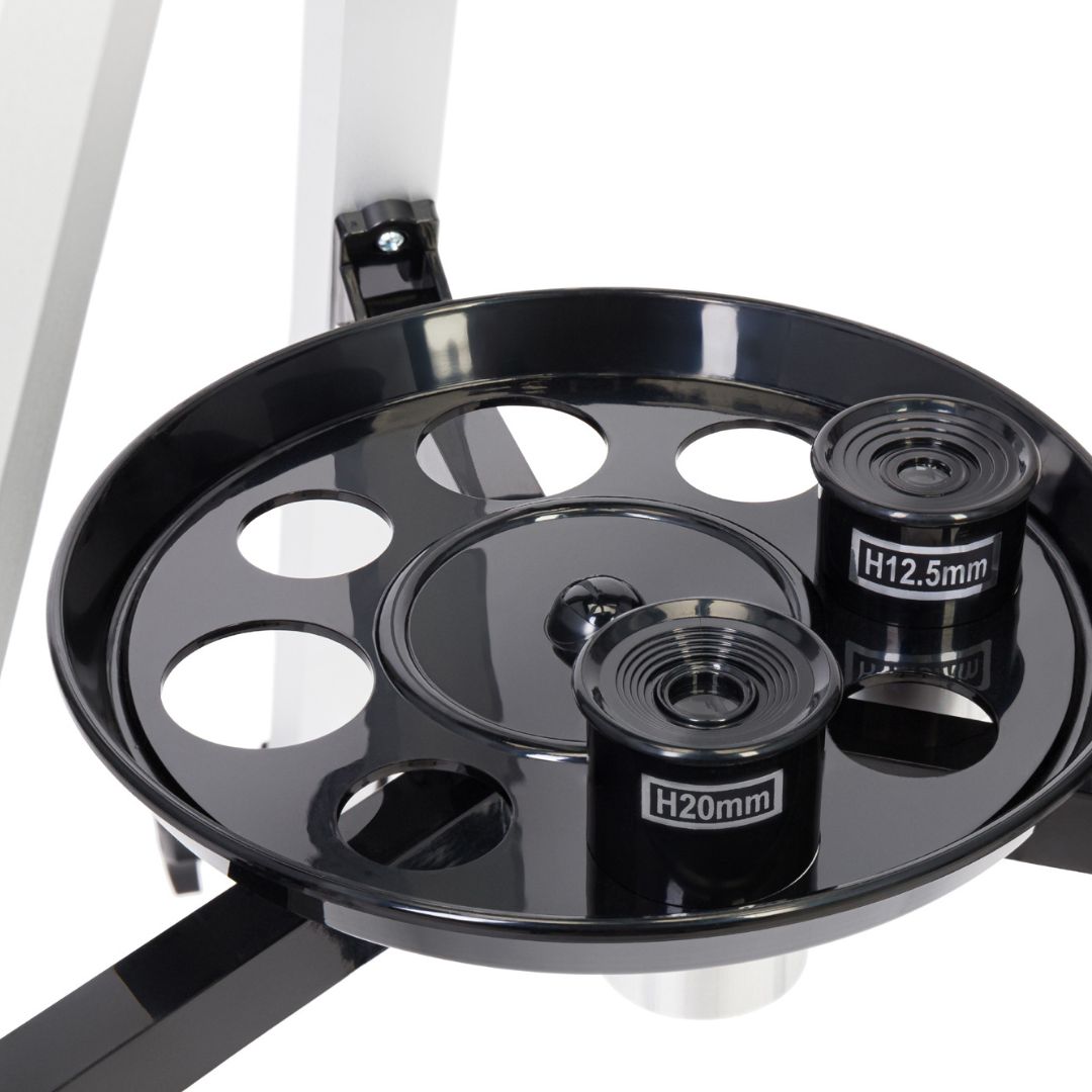 El elemento principal de la óptica del telescopio Discovery Spark Travel 76 es un espejo esférico. Todas las superficies ópticas tienen un revestimiento antirreflectante, lo que hace que la imagen producida sea nítida, clara y brillante. El tubo del telescopio apunta a objetos con una montura altazimutal que tiene una perilla de bloqueo en su eje vertical, lo que hace que todo el proceso de apuntar sea más suave y preciso. El trípode está hecho de metal y se complementa con una bandeja de accesorios, muy práctica para colocar los oculares y una lente Barlow 2x, que ya están incluidos en el kit.