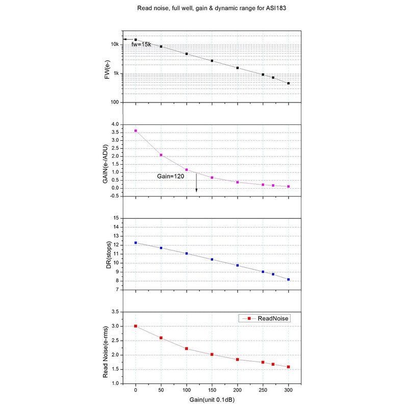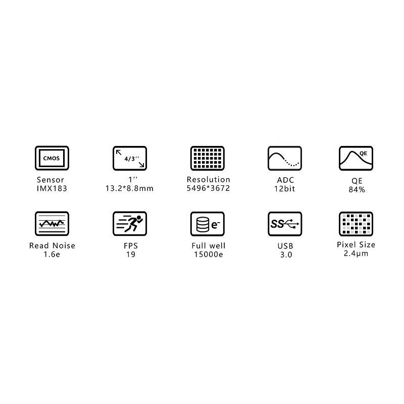 Especialmente diseñados para aplicaciones astronómicas, los sensores IMX183CLK-J (monocromático) y IMX183CQJ-J (color) de Sony se alojan en un diseño de alta sensibilidad con retroiluminación (BSI) y píxeles de solo 2,4 µm. Las cámaras ASI 183 presentan una carga Full Well Capacity extraordinariamente alta de 15 000 electrones para unos píxeles tan pequeños.