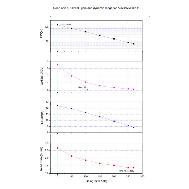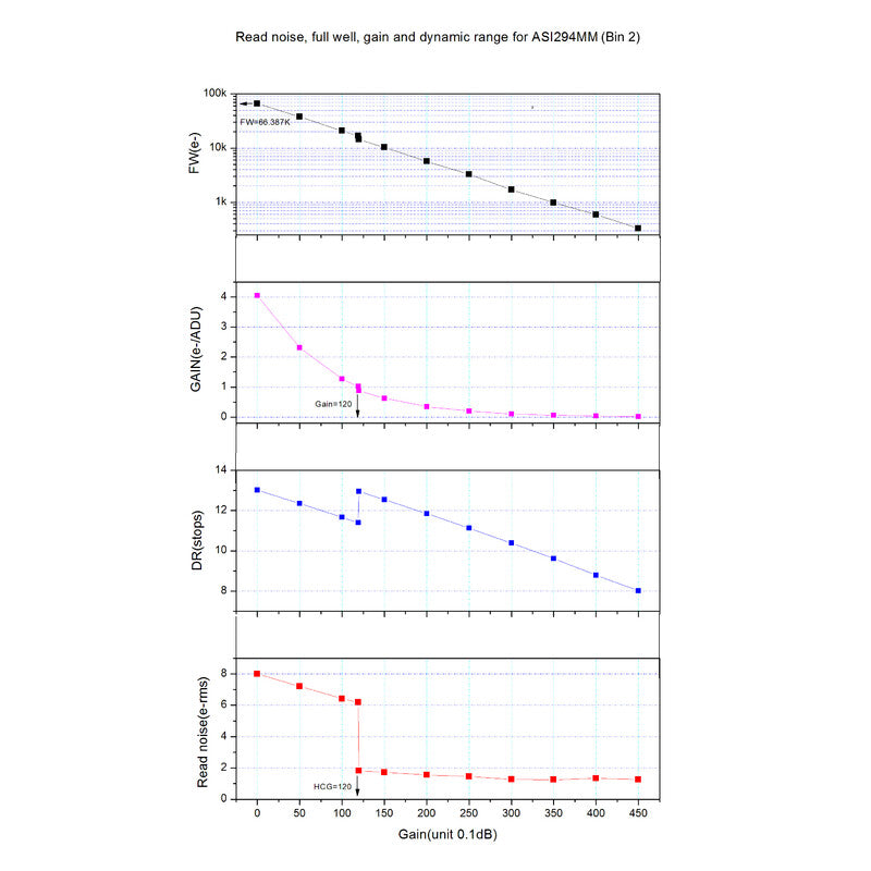 Si la ganancia (preamplificación) se ajusta por encima de 120, el ruido de lectura se reduce por debajo de 2e. A pesar de la sensibilidad extremadamente alta, se obtienen imágenes con poco ruido.